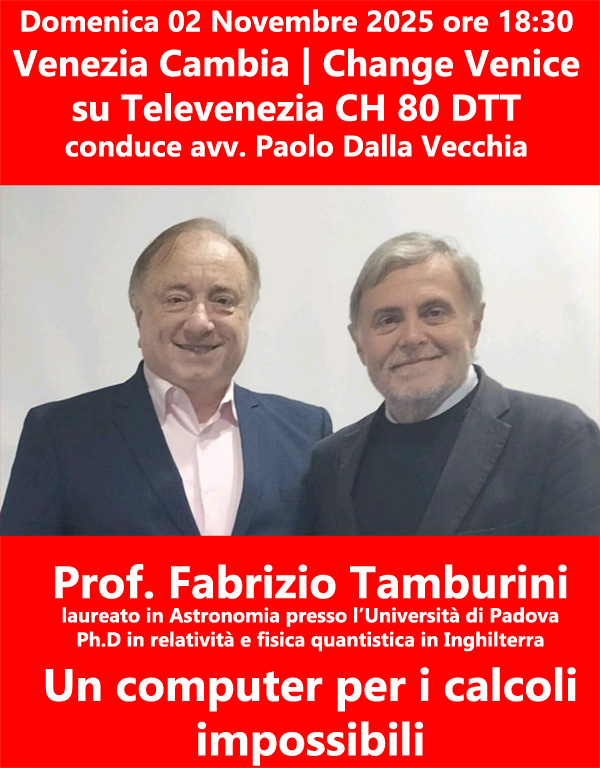 … Domenica 02 Novembre 2025 ore 18:30 su TeleVenezia (CH 80 del digitale terrestre) FABRIZIO TAMBURINI ospite a Venezia Cambia | Change Venice Un computer per i calcoli impossibili Prof. Fabrizio Tamburini, laureato in Astronomia presso l’Università di Padova, Ph.D in relatività e fisica quantistica in Inghilterra. Conduce la trasmissione Venezia Cambia | Change Venice…