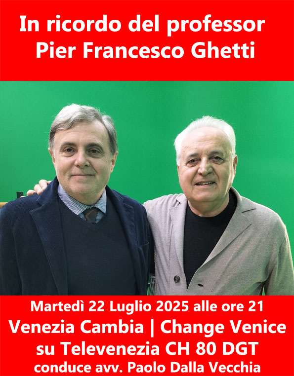 … Questa sera (Martedì 22 Luglio 2025 ore 21 su Televenezia Ch 80 DTT) verrà messa in onda la replica dell’intervista al prof. Pier Francesco Ghetti, ecologo e idrobiologo, ex Rettore dal 2003 al 2009 del Ca’ Foscari di Venezia. spentosi all’età di 81 anni il 20 Luglio 2025